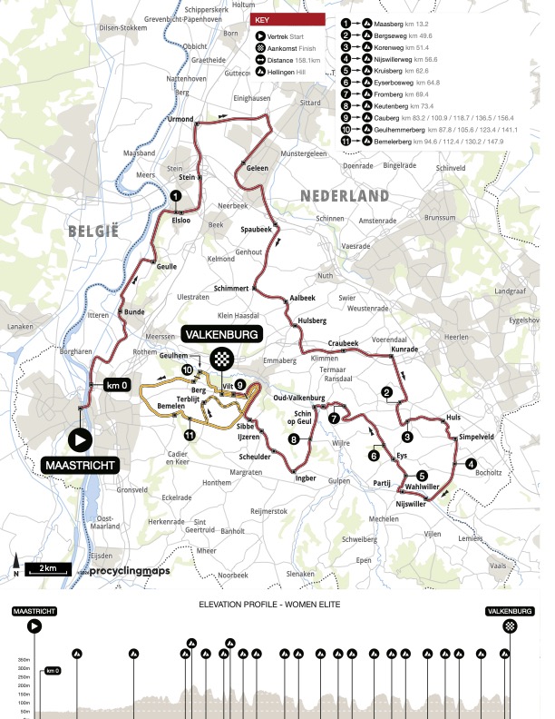 Similar to last year, the race will starts in Maastricht and finishes in Valkenburg and ends with a 17.8-kilometre circuit which the women tackle four times.