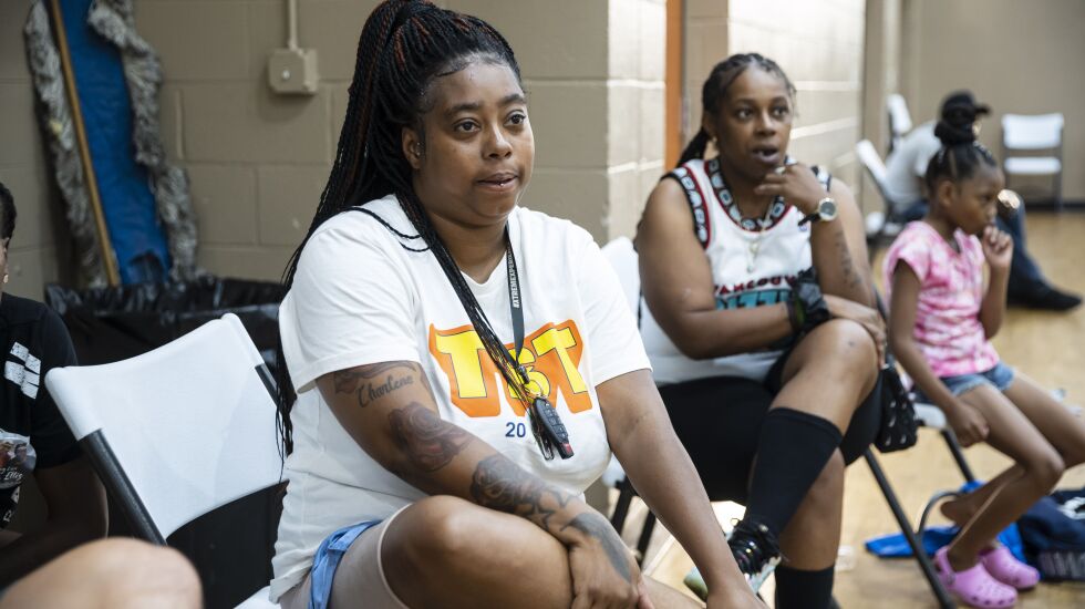 Inside the gym, a larger group of boys takes one half and a handful of boys takes the other. Adults give pointers on both sides and mothers Davida Wright and Monique McGhee watch with Ellis from the sidelines with their daughters.