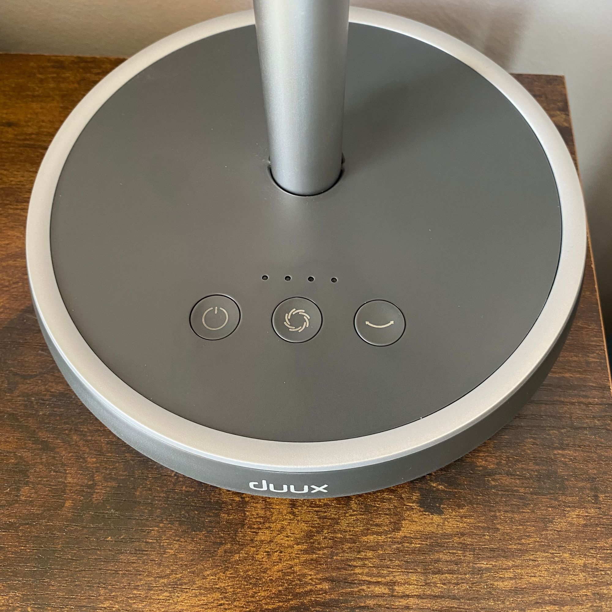 Using the Duux Rize is really simple — there's no remote or app, just three buttons on the base: power, wind speed and oscillation, plus four lights that indicate wind setting and, if you press and hold the power button, how much battery you have.