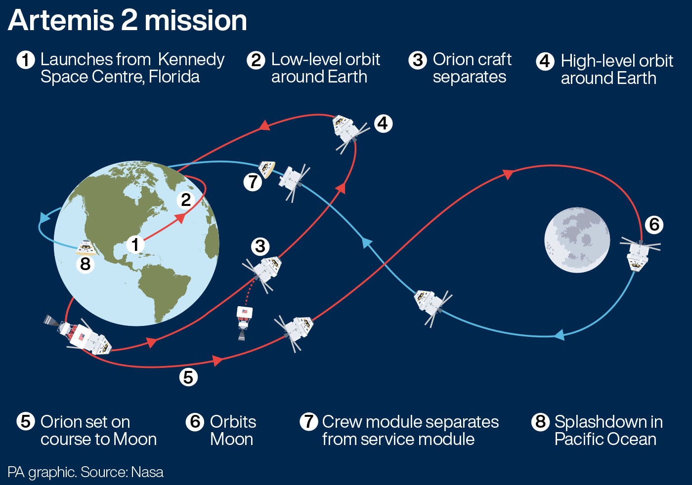 The 10-day lunar flyby will send the crew some 252,000 miles (406,000 kilometres) into space before returning to Earth.