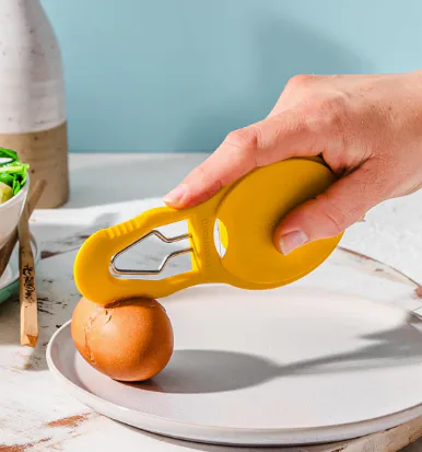 This clever little peeler takes the hassle out of prepping soft- and hard-boiled eggs. It firmly cracks eggs, then uses a paddle to gently peel away the shell. The built-in slicer gives even portions with one swift motion. In just seconds, you’ll be ready for breakfast or an egg salad sandwich.