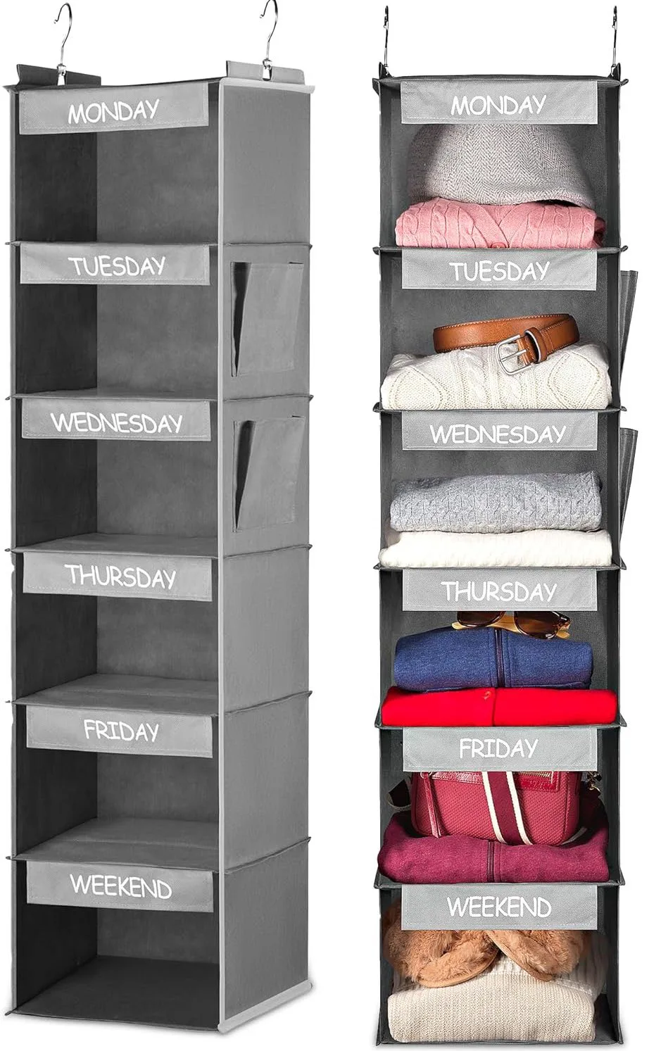 If mornings feel chaotic, this weekly outfit organizer is a total game changer. With labeled sections for each day, you can plan outfits ahead of time and skip the last-minute scramble. It’s sturdy enough to hold full outfits — including shoes and accessories — and the hooks hang right over your closet rod.