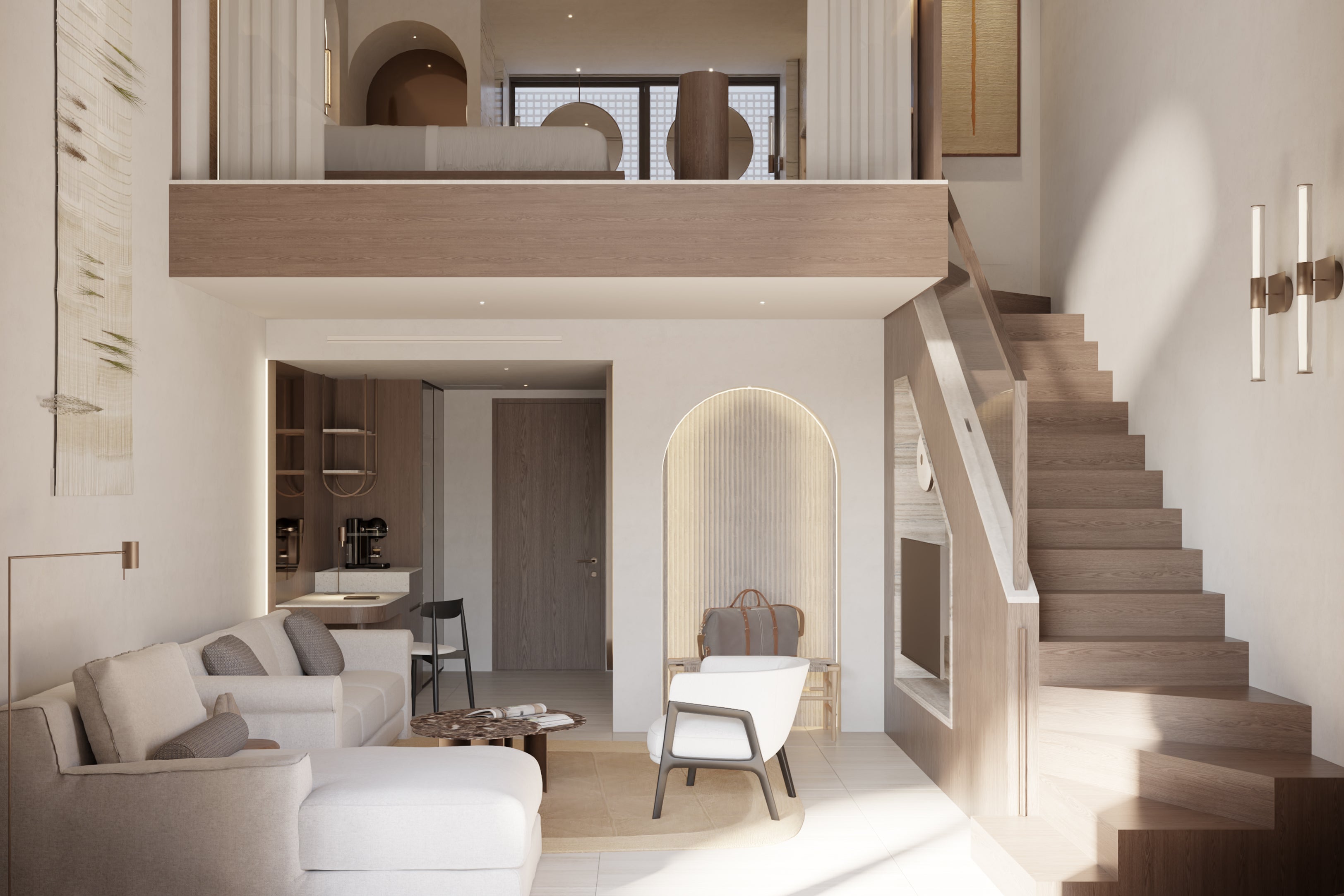 The 202 rooms and villas are decorated in neutral tones, with marble and wood details punctuated by contemporary artwork. Balconies overlook the sea.